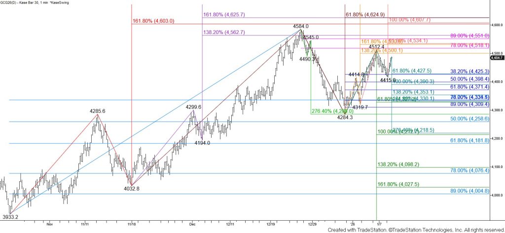 February gold’s pullback from $4584 looks like it is a completed correction. The $4286 XC (2.764) projection of the first wave down from $4584 and the 38 percent retracement of the rise from $3933.2 held on a closing basis. The subsequent rise fulfilled the $4500 intermediate (1.382) target of the wave up from $4284.3 and settled above the 62 percent retracement of the decline from $4584. Most recently, the 38 percent retracement of the rise from $4284.3 held and prices rose above the $4478.4 corrective swing high, invalidating the prior primary wave down from $4512.4.