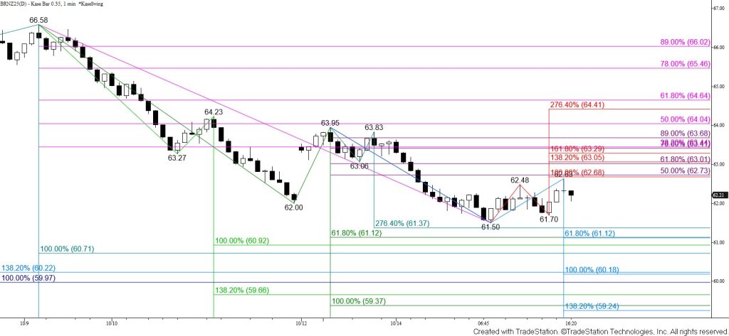 The daily KasePO and Stochastic are oversold, and the RSI is nearing oversold territory. There are no bullish patterns or confirmed signals that call for the move down to stall, but the oversold momentum oscillators warn that another test of resistance might occur soon. Moreover, for the near-term, the intraday wave up from $61.50 shows potential to extend to $63.1 and possibly $63.4. The $63.4 level is expected to hold. Overcoming this would call for a test of key near-term resistance at $64.0. This is in line with the $63.95 swing high, the 50 percent retracement from $66.58, and Friday’s midpoint. Settling above $64.0 would shift the near-term odds in favor of Brent rising to $64.5 and higher.