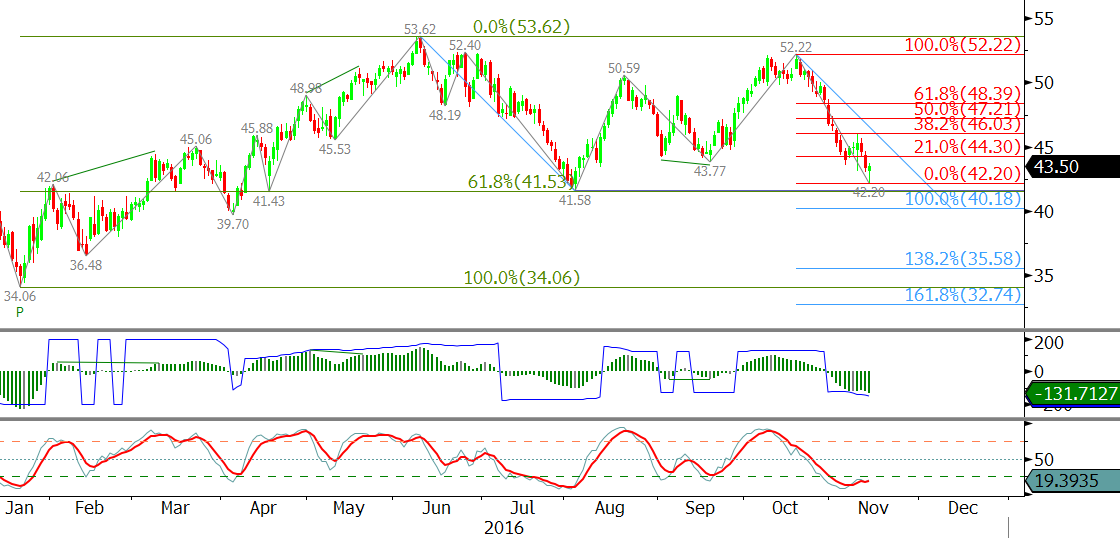That said, on Monday the move down stalled at $42.2 and formed a bullish hammer. This is a reversal pattern setup that indicates the upward correction may extend first. The hammer’s completion point is $43.9 and the confirmation point is $44.4.