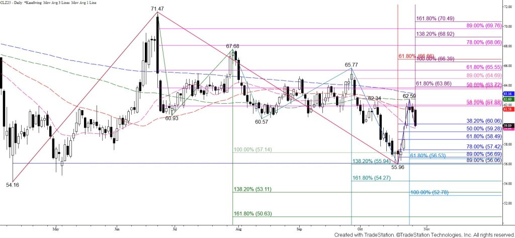 December WTI crude oil is pulling back after testing and holding the 38 percent retracement of the decline from $71.47 and the 62 percent retracement from $65.77 at $62.0 on a closing basis. The move up from $55.96 was due for a correction, and today’s decline completed Friday’s shooting star by settling below last Thursday’s $60.9 midpoint. A daily bearish KCDpeak (overbought signal) was also confirmed, but this could prove to be a bullish signal because it formed so quickly.
