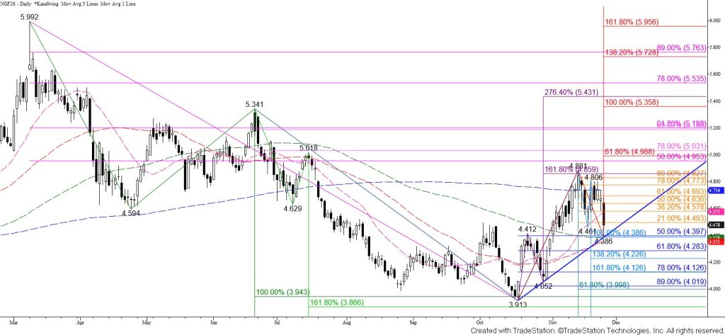 The near-term outlook is bearish, and taking out $4.44 will call for another test of $4.39. Settling below $4.39 will strongly suggest that a reversal is underway. This will also clear the way for a minor target at $4.34, a test of the 62 percent retracement of the rise from $3.913 at $4.28, and the $4.23 intermediate (1.382) target of the wave down from $4.881 in the coming days.