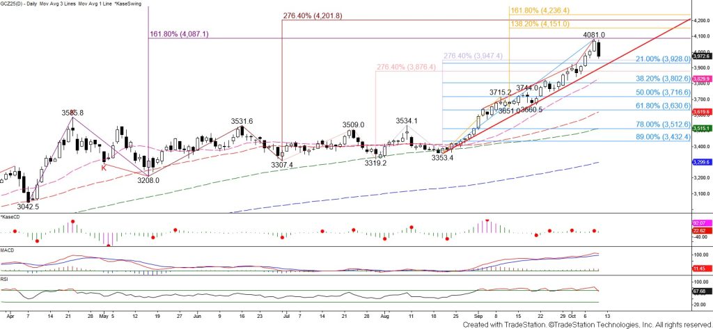 Gold has been in a parabolic rise for several weeks after breaking higher out of a flat ascending triangle in early September. Monthly, weekly, and daily momentum oscillators have been overbought, and any pullback has been a short-lived correction. Daily trend indicators are bullish, prices are trading well above the bullish stack of rising major daily moving averages, and the trend line up from $3353.4 has held. Therefore, the uptrend is firmly intact.